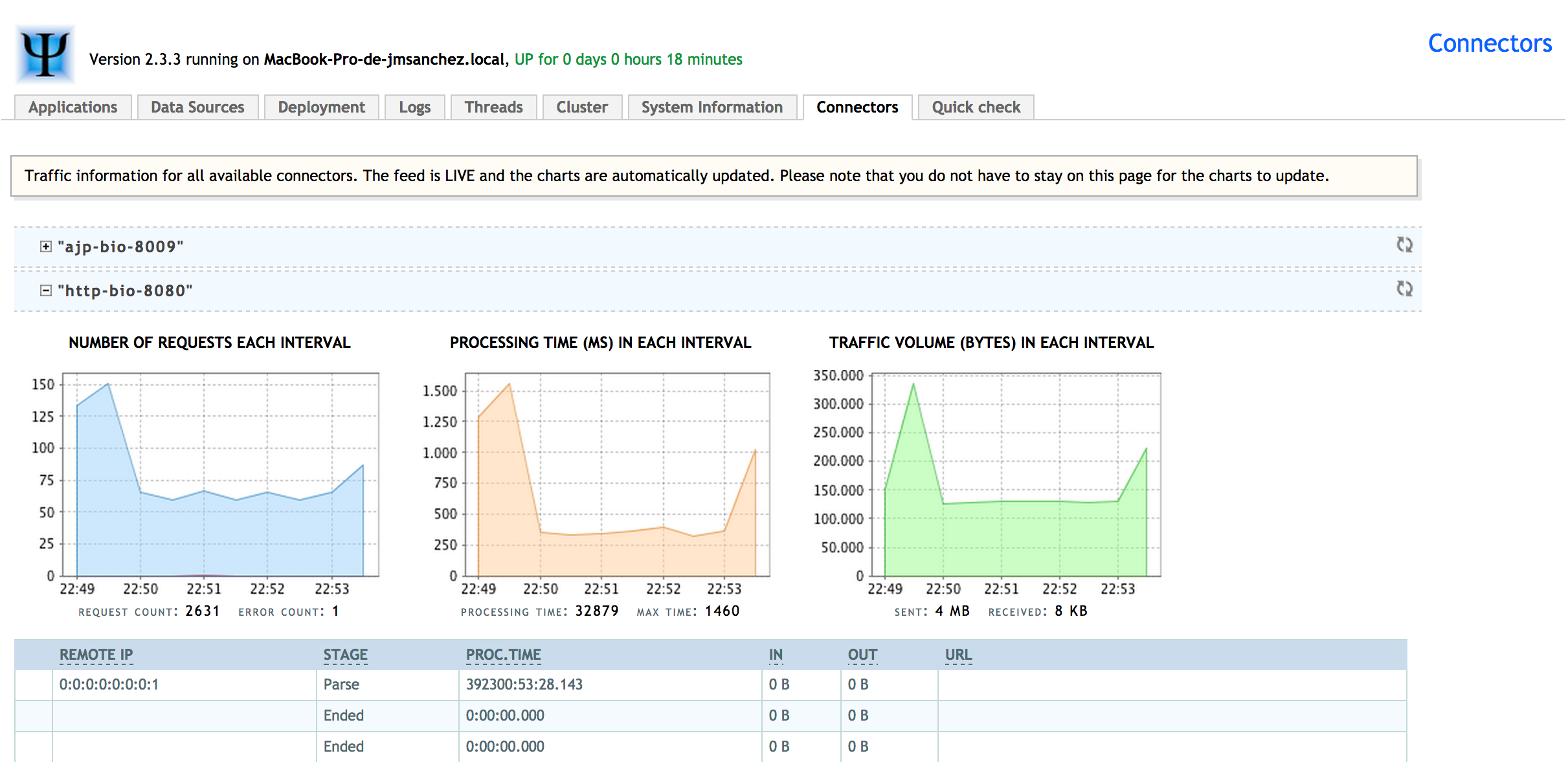 En la pestaña de conectores podemos acceder a la monitorización de las peticiones que se realizar a través de los distintos conectores, disponiendo de informción gráfica sobre número de peticiones, tiempo de proceso y volumen del tráfico de estas conexiones.